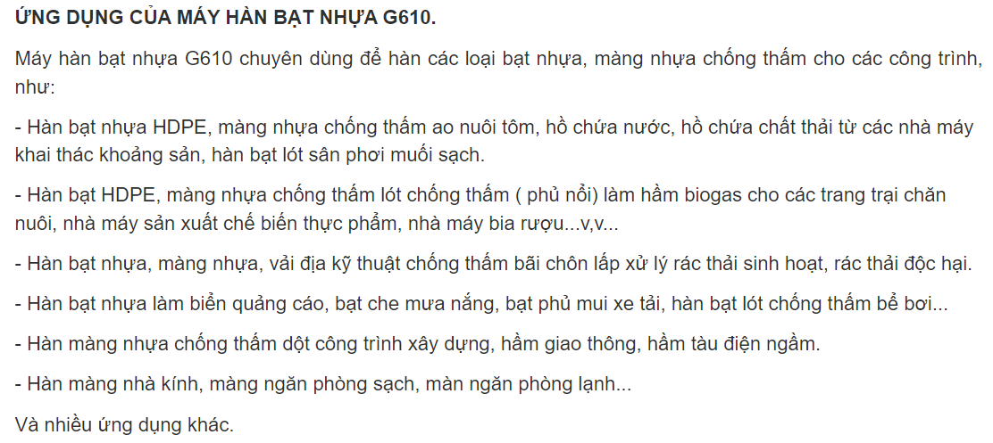 Máy hàn bạt nhựa G615 và G610 là model máy hàn bạt nhựa tự động chất lượng, thiết kế an toàn cho người sử dụng. Máy hàn bạt HDPE, máy hàn bạt PVC, máy hàn bat ao nuôi tôm, máy ép bạt nhựa.